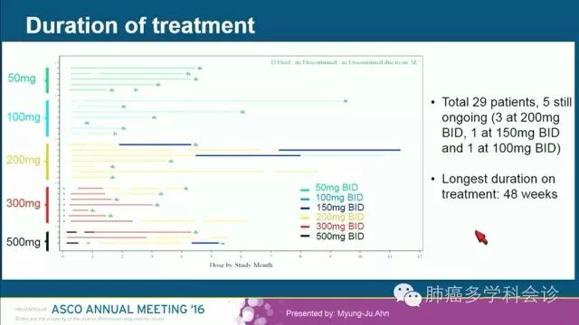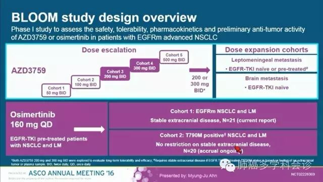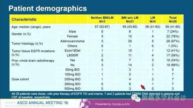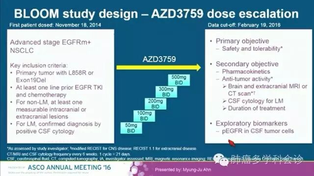 非小细胞肺癌(NSCLC)脑转移、脑膜转移很常见,一代 EGFR-TKI 透过血脑屏障的能力较差,在治疗 EGFR 敏感突变的 NSCLC 患者时,脑和/或脑膜转移常会成为 TKI 治疗失败的主要表现形式之一。 AZD3759 是第一个有效通过血脑屏障的EGFR-TKI,在治疗伴 EGFR 突变的 NSCLC 中枢神经系统转移患者方面显示出较明显的优势。 在2016 ASCO年会上报告了 AZD3759 的 I 期试验结果,包括它的安全性、药代动力学、疗效和生物标志物等方面的数据。这是针对EGFR敏感突变的 NSCLC 患者的一项非盲、多中心研究,由阿斯利康公司发起 (NCT02228369)。 入组患者至少曾接受过一线EGFR TKI和一线化疗后进展,剂量从50mg bid 到 500mg bid 共 5个剂量组,每组至少包括 2 个脑转移和 1 个脑膜转移的患者。29 位患者中有 17 人曾接受过脑部放疗。 AZD3759 在 300mg bid 以下剂量时患者都能较好地耐受,最长治疗时间超过 40 周。最常见不良反应有皮疹。作者较详细地介绍了该药的疗效:除了肿瘤大小外改变,还包括脑脊液中肿瘤细胞减少/清除和对肿瘤细胞中 pEGFR 的抑制等。 以下是该研究在2016 ASCO年会上报告的内容: